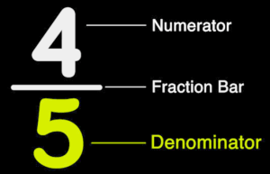 - The denominator (the bottom number of the fraction) tells you how many equal parts the whole is divided. In this case, the pizza is cut into 4 parts, so the denominator is 4.