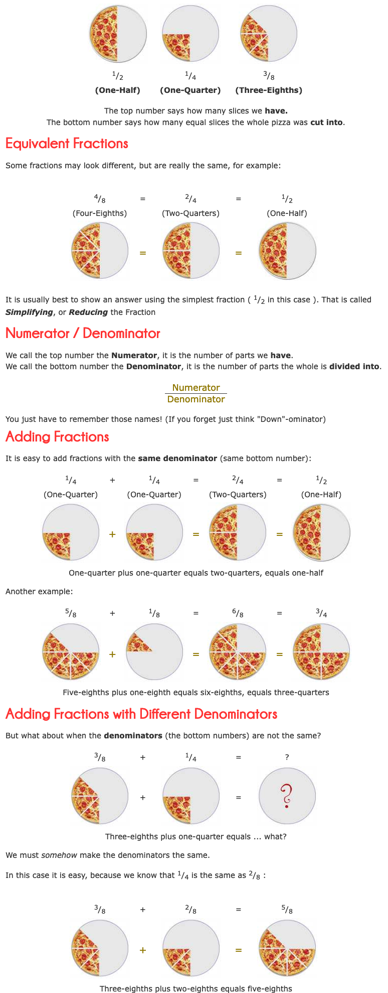 Maths – Fractions Part 2 – Examples, Quizs, introducing decimals & More Pizza